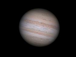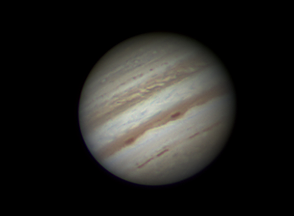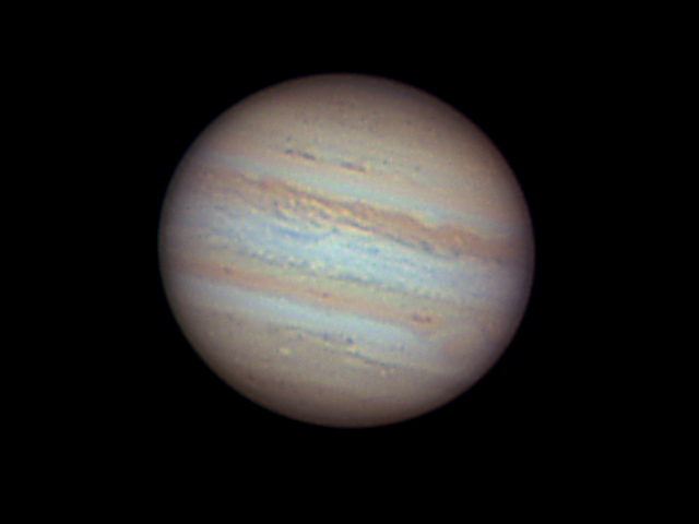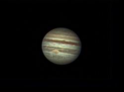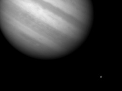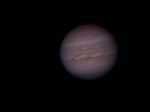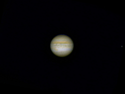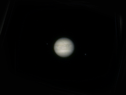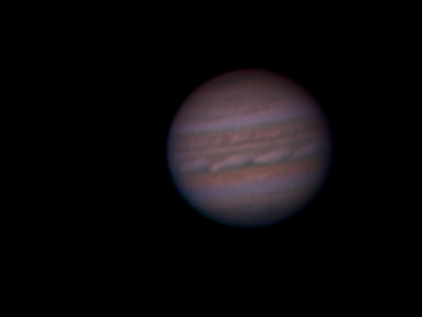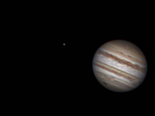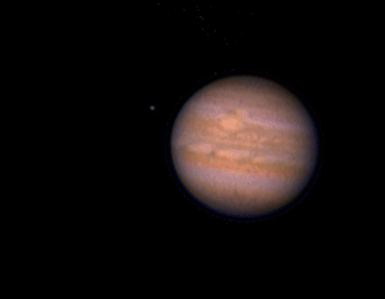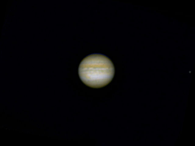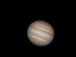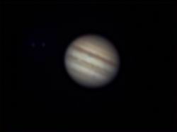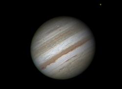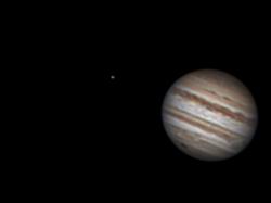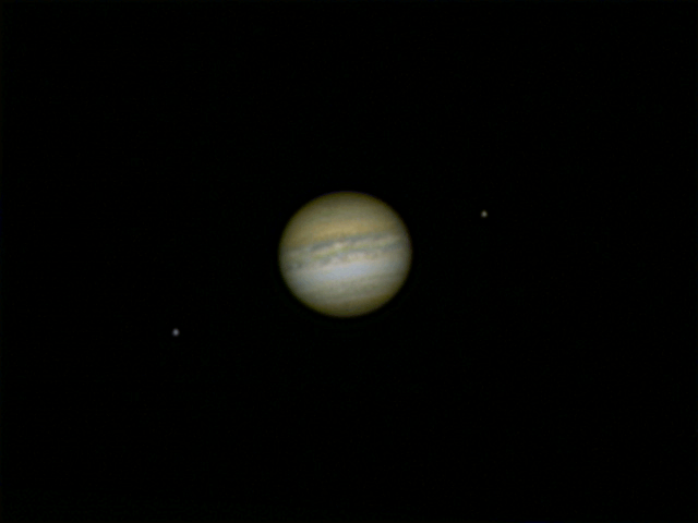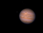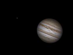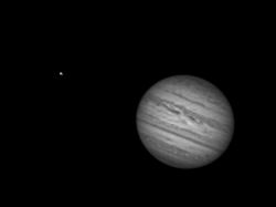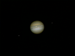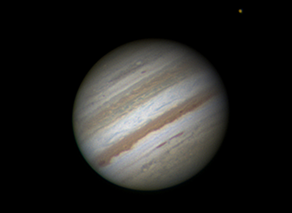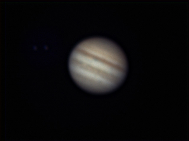 Der Mond dürfte Europa sein. Aufnahmedaten: Meade ACF16" (==>) 9m Brennweite mit TV2 Barlow, DMK21 (alte Version), Astronomik RGB Filter, 1200 Frames pro Kanal, davon ca. 120 gemittelt mit Avistack, Schärfung in Giotto, Endschärfung in Fitswork, Tonwerte in Photoshop.