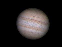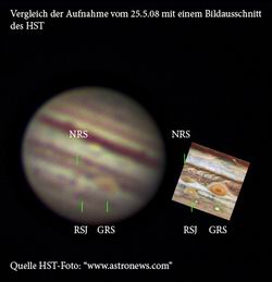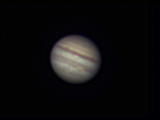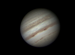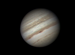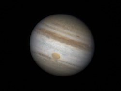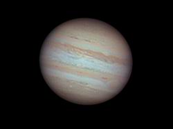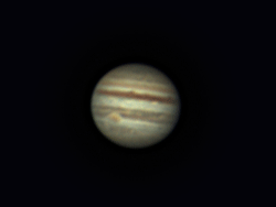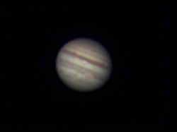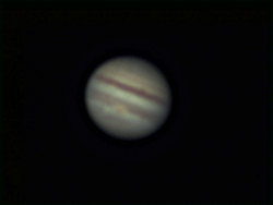 Ein weiteres Bild zeigt den Mond Ganymed (unterstes Bild), auf den ich nur mal zum Probieren gehalten habe. Leider war er weit weg vom Planeten, so dass ich ihn wie einen Einzelstern betrachtete. Zentriert wurde auch dieser in Giotto in Vierfachsuperresolution und anschließend in Fitswork auf 2x (also auf doppelte Originalbildgröße = ca. 18m Brennweite) zurückverkleinert. Es ist etwas zu sehen, jedoch sind solche hauchfeinen Strukturen immer mit Vorsicht zu genießen. Angesichts des guten Seeings halte ich eine Detailsichtbarkeit auf Ganymed durchaus für realistisch. Kann das jemand nachgucken?! Es war genau 5.21 Uhr am 2.8.2011. Ich habe Ganymed relativ rötlich dargestellt - die Rohdaten sind aber aus R, G und B ebenfalls wie beim Jupiter entstanden. Daten zu den Aufnahmen: RGB Farbkanäle, 1/30 Sekunde Belichtungszeit pro Frame, 30 Frames/s, 1200 Frames/Kanal, 150 Frames gemittelt/Kanal, Schärfung in Giotto, Feinschliff in Fitswork, Tonwerte in Photoshop. Gerätedaten: Meade 16" ACF, Barlow Televue TV2 (Brennweite dadurch genau 9m), Astronomik 1,25" RGB Filter Typ 2c, DMK21 (alte Version), Montierung: Losmandy G11 (ja, es geht!) mit FS2.